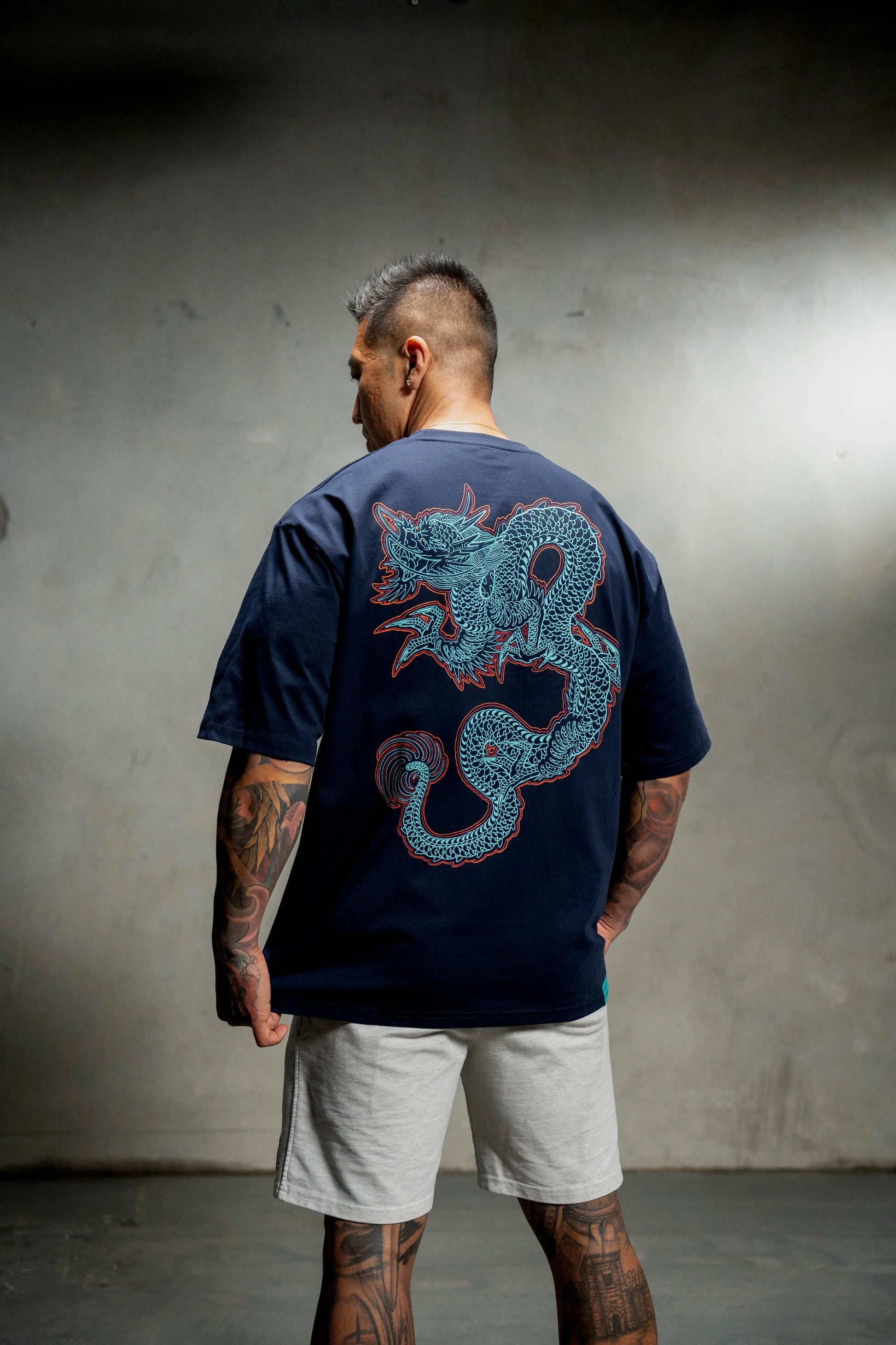 Họa tiết irezumi sắc nét trên form áo oversize mang tinh thần Nhật cổ hòa vào phong cách streetwear hiện đại. Một lựa chọn dành cho những ai yêu tattoo và thích hình tượng ryū vừa huyền bí vừa mạnh mẽ.